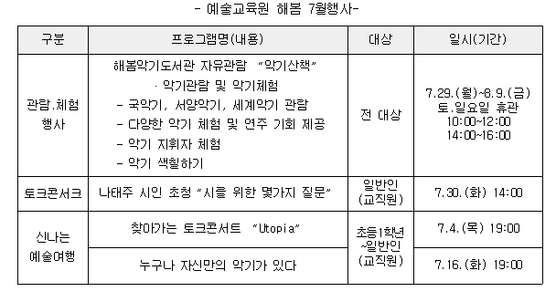 경상남도교육청예술교육원해봄에서는 2024년 여름방학을 맞이하여 7월에 아래와 같은 행사를 진행하고자 하오니 많은 학생과 학부모, 교직원분들의 관심과 참여를 바랍니다.